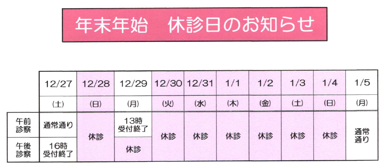 12月30日(火)~1月4日(日)まで休診させていただきます。